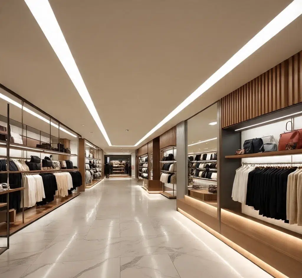 Luxury stores focus on atmosphere and brand identity. High-quality linear lighting systems are used to create refined and visually appealing spaces.