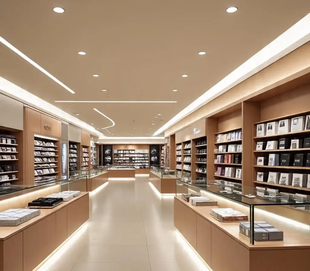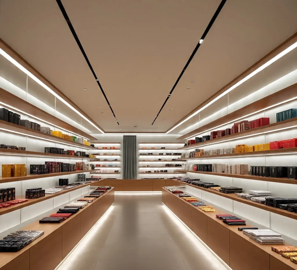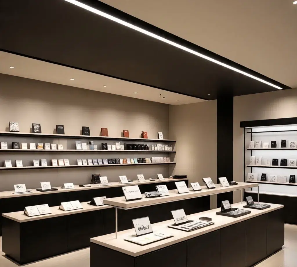 Shelves, racks, and display tables benefit from integrated linear lighting that highlights merchandise.