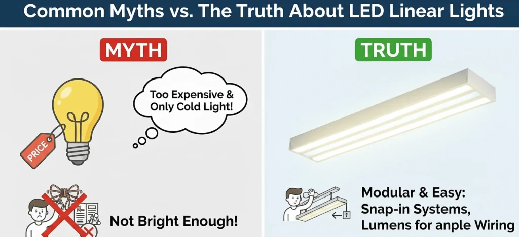 Many myths about LED linear lights come from outdated information or low-quality products. When chosen correctly, LED linear lights are efficient, bright, safe, and long-lasting.