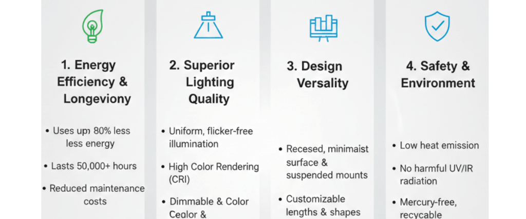 LED linear lights consume less electricity than traditional lighting. They provide high brightness while using less power, helping reduce energy bills. For homeowners and businesses, this makes them both cost-effective and eco-friendly.